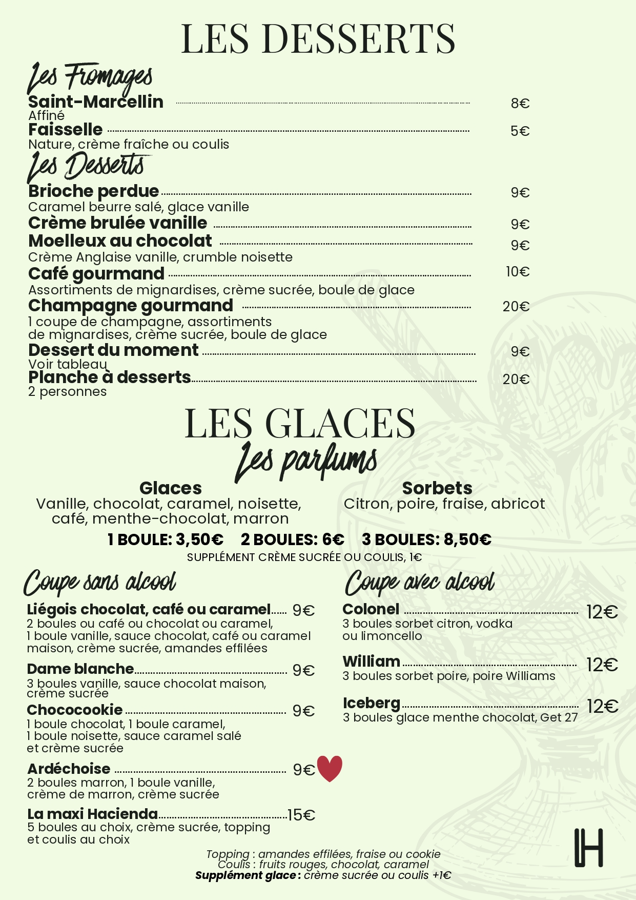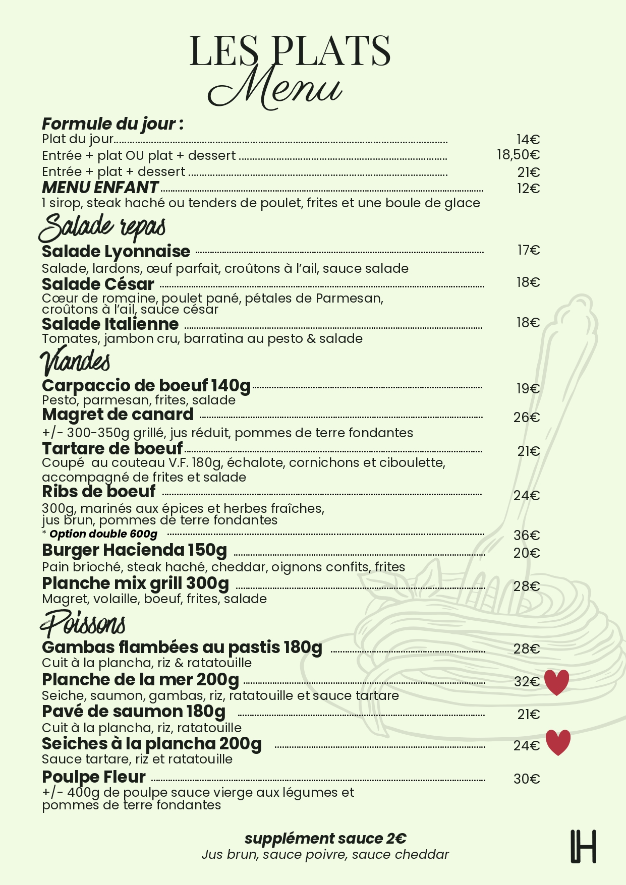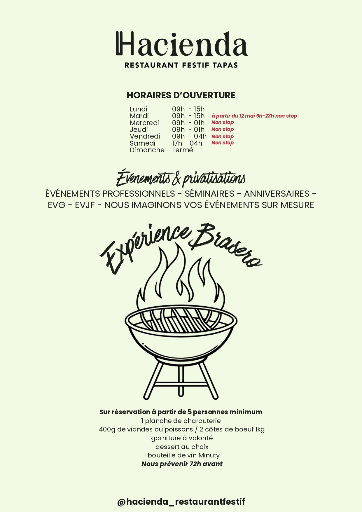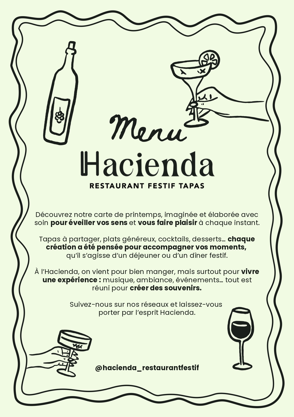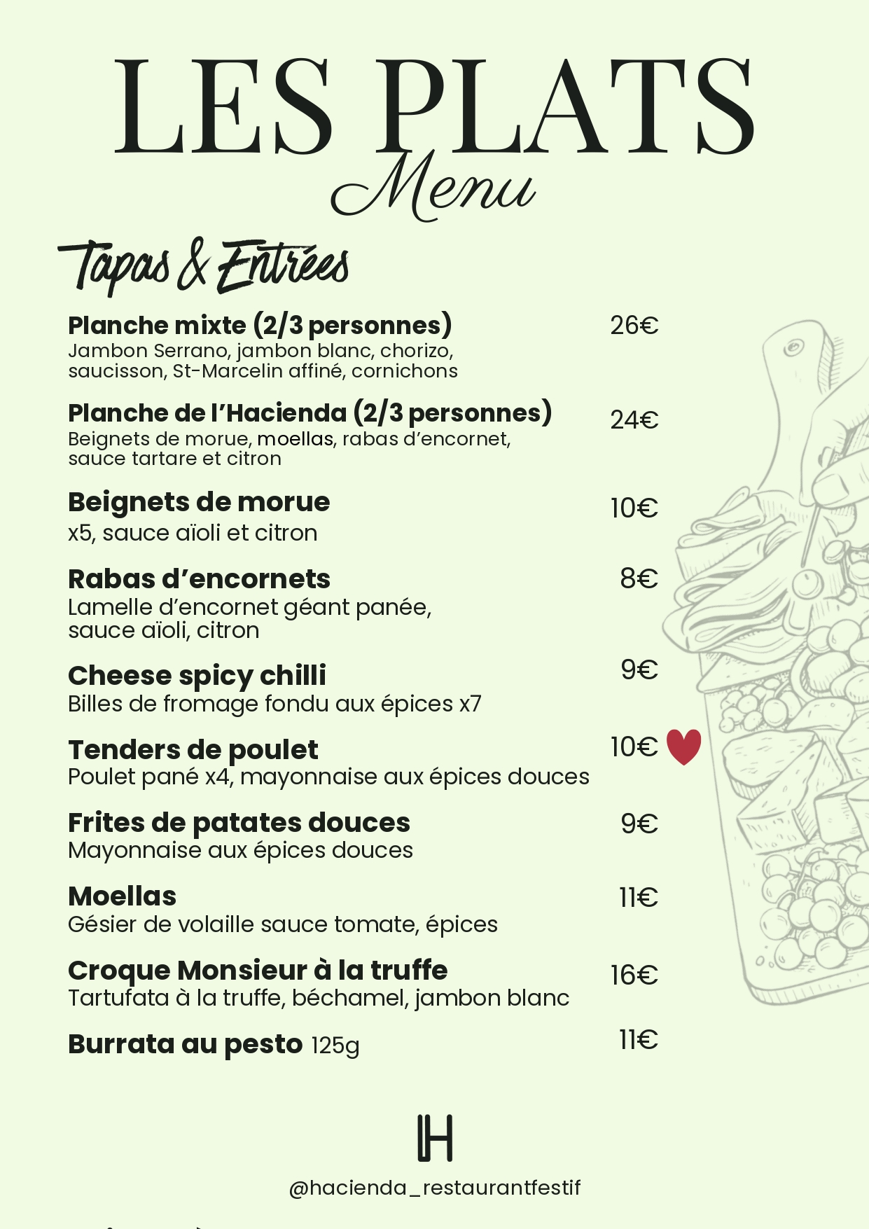 Bienvenue à l’Hacienda, une adresse conviviale où tout est fait maison ! Savourez une cuisine généreuse et créative à prix doux avec notre formule déjeuner à moins de 20€. Le soir, partagez tapas et planches autour de vins soigneusement sélectionnés, bières artisanales ou cocktails savoureux. Ambiance détendue, tarifs attractifs : un vrai moment de plaisir.